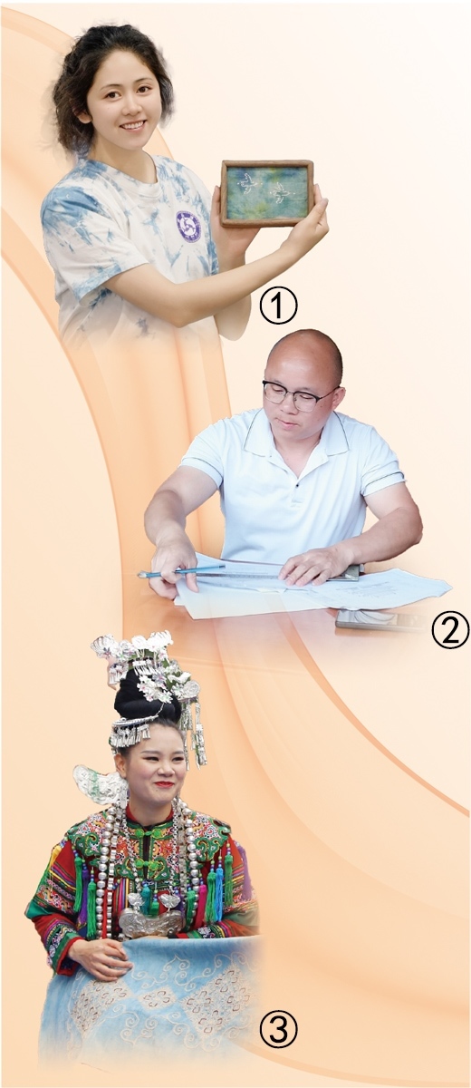 圖①:陸江磊展示蠟染刺繡擺件產品。