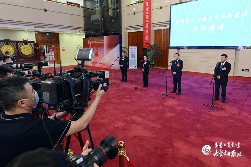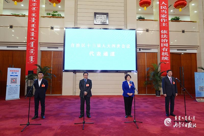 1月27日晚,自治區(qū)十三屆人大四次會(huì)議“代表通道”集中采訪活動(dòng)在內(nèi)蒙古人民會(huì)堂玻璃廳舉行,8位人大代表分兩組“亮相”。這是自治區(qū)人大首次開通“代表通道”。圖為人大代表陳功明、劉淑華、唐毅和龔明珠4位代表(從左至右)回答記者提問(wèn)。內(nèi)蒙古日?qǐng)?bào)記者 金泉 攝