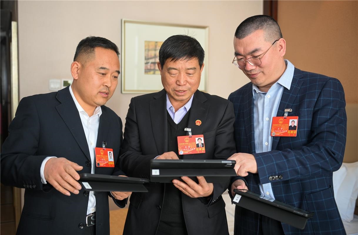 出席自治區(qū)十四屆人大二次會議的人大代表丁慧杰(左)、李?。ㄖ校?、石海認(rèn)真研讀會議材料。