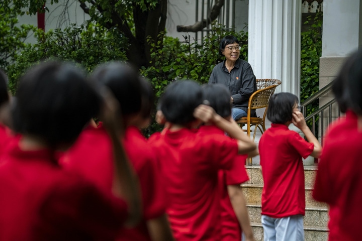 張桂梅觀看新生學(xué)習(xí)課間操(2021年8月24日攝)。新華社記者江文耀攝