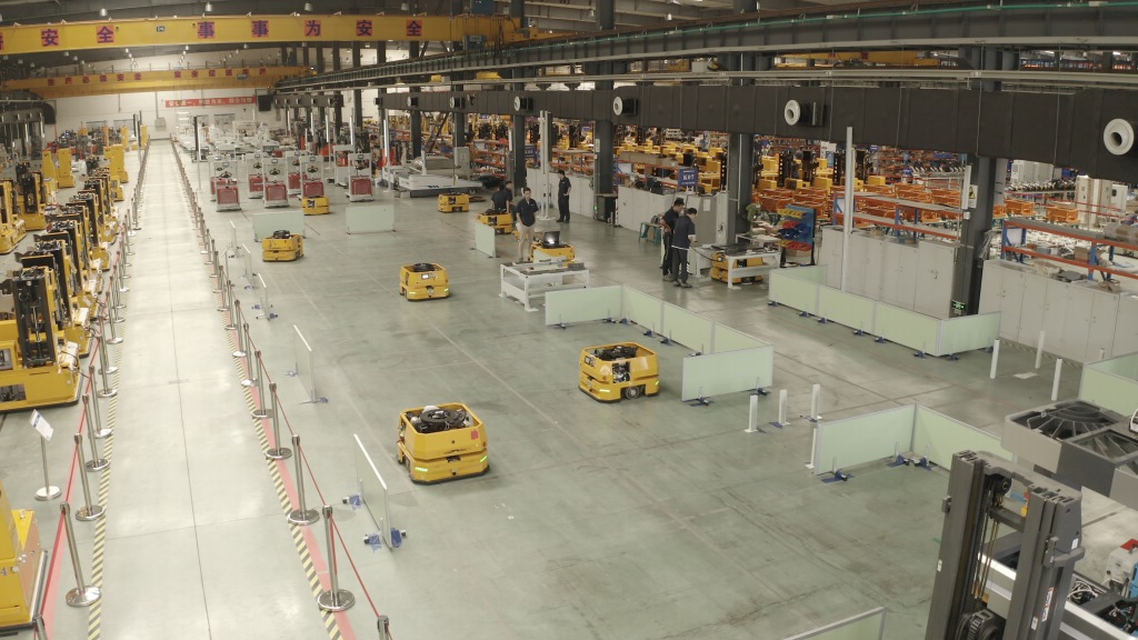 在長春一汽解放J7智能工廠內(nèi),還未加裝輪胎的車體通過移動(dòng)機(jī)器人,從一個(gè)工位來到另一個(gè)工位,與工人配合著完成裝配工作。