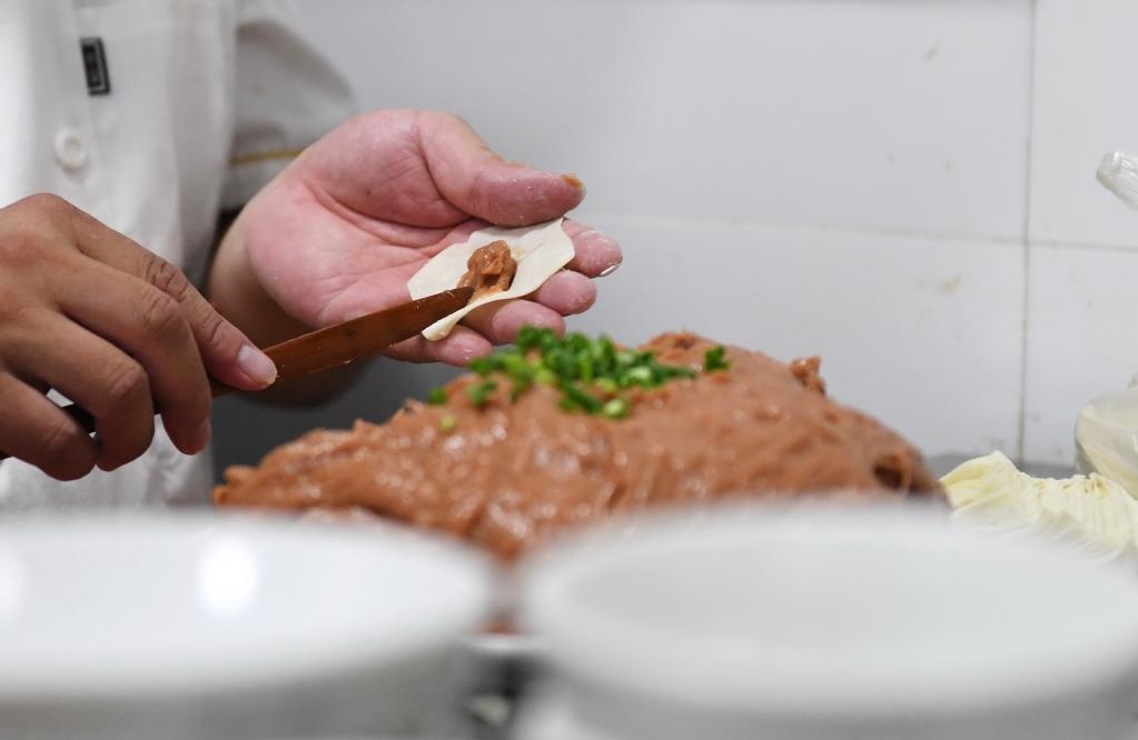 “以前手打三到四斤肉餡,要50多分鐘,現(xiàn)在用機(jī)器打餡,十分鐘就能完成,既提高了效率,也保證了肉餡的新鮮度和韌勁?!蓖跏I說。
