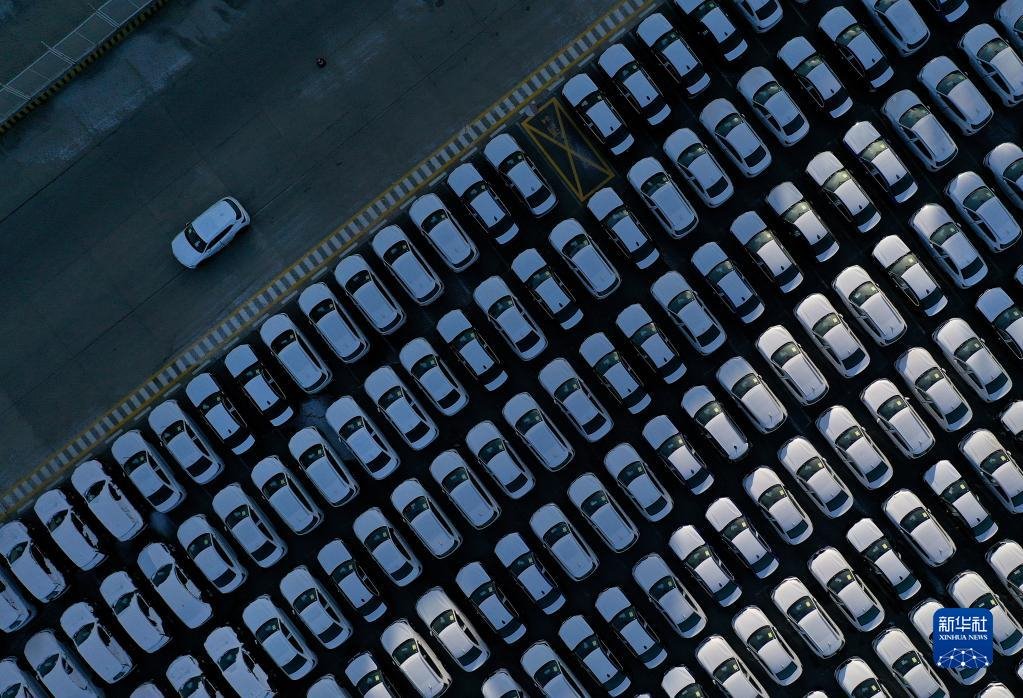 2021年1月29日,一輛運(yùn)送中的商品車行駛在大連港汽車碼頭(無(wú)人機(jī)照片)。新華社記者 姚劍鋒 攝