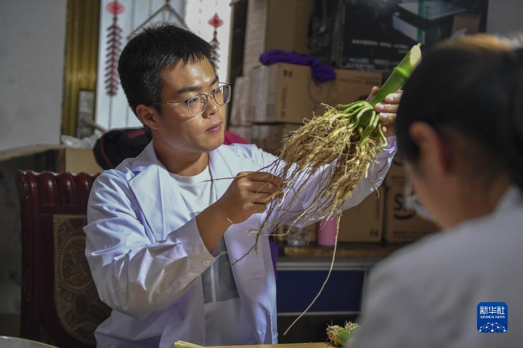 2021年8月2日,在吉林省梨樹(shù)縣四棵樹(shù)鄉(xiāng)三棵樹(shù)村“科技小院”,中國(guó)農(nóng)業(yè)大學(xué)學(xué)生沙野查看玉米根系樣本。新華社記者 張楠 攝