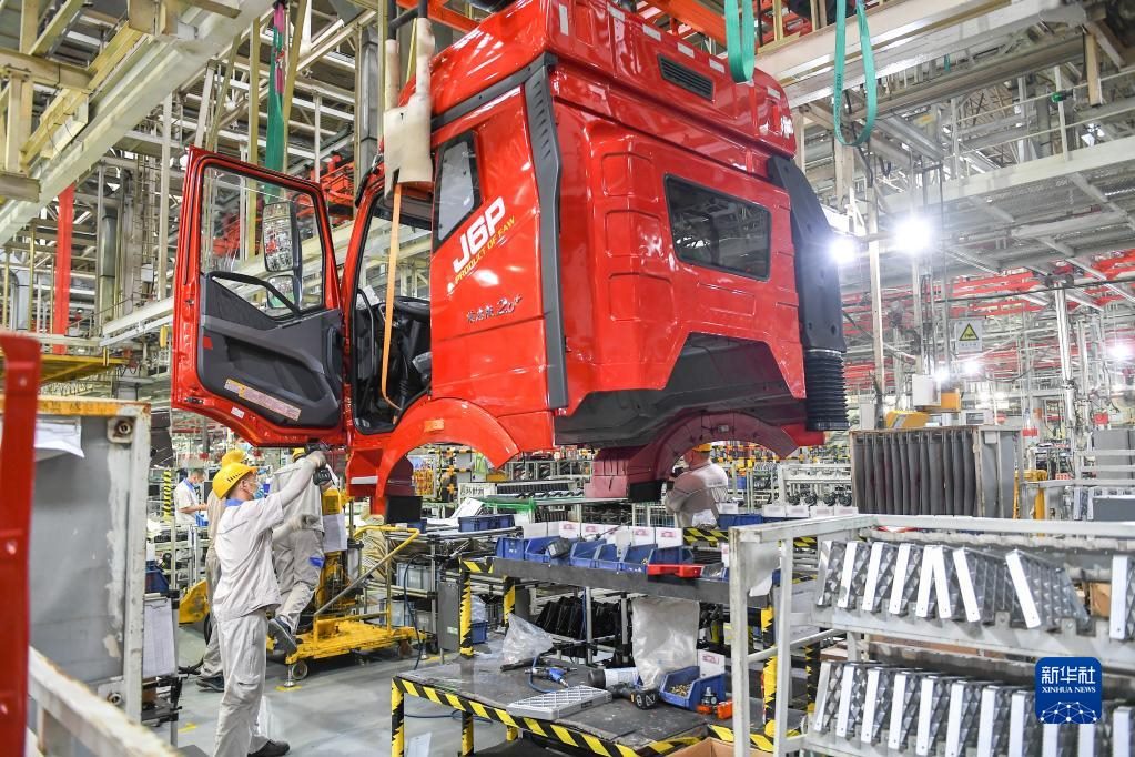工人在位于吉林省長(zhǎng)春市的一汽解放總裝車(chē)間裝配車(chē)輛(2021年7月7日攝)。新華社記者 張楠 攝