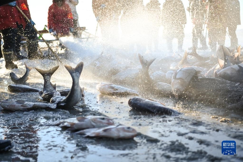 漁民在查干湖里捕魚(yú)(2021年12月26日攝)。新華社記者 顏麟蘊(yùn) 攝