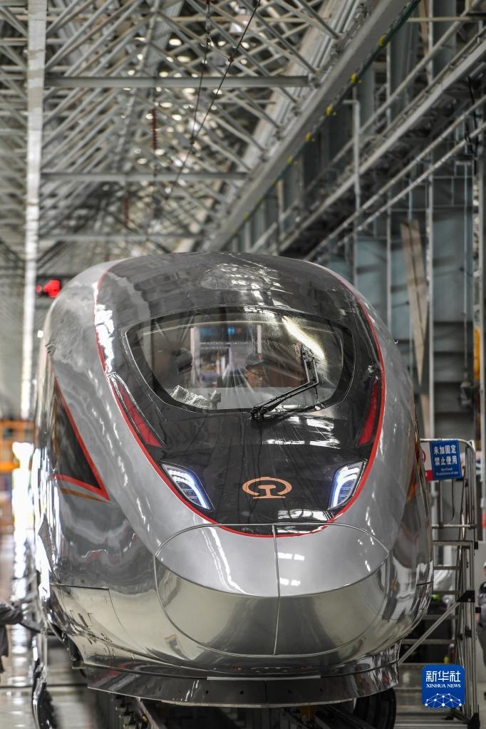 2021年6月15日在中車(chē)長(zhǎng)客高速動(dòng)車(chē)組制造中心拍攝的復(fù)興號(hào)智能動(dòng)車(chē)組。新華社記者 張楠 攝